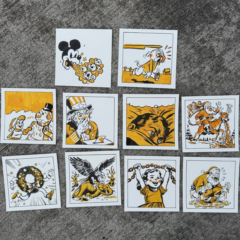 If you’ve ever wanted my slipcased graphic novel trilogy — 288-pages of four-color fun, (Broken Pencil calls it madcap and a pleasure to read) AND one of my ink drawings from Instagram, you can get this combo if you are one of the first ten people to send me an email and let me know you’re interested. The drawings are ink and watercolor and were all used on my Instagram last year. Use the word “BUNDLE” in the subject line. The slipcase of books and the drawing bundle is $125 postage-paid, but only within the US. You need to get on the list by Sunday evening, as I will be sending everything by priority mail on Monday. Paypal or Venmo only. There are only a few left, so don’t sleep on it.