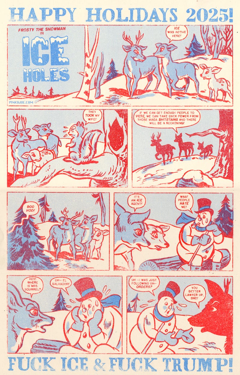 The other thing I’m doing is giving away FREE copies of a two-color 2025 “holiday” riso poster, but only to people who donate at least $50 to their local food bank. $50 will provide more than 150 meals. The sale of 10 posters will feed 1,500 people — that’s almost as many people as the small town where I grew up. E-mail me the receipt with the delicate bits blacked out by Sunday night, along with your address, and I’ll send you a rolled-up poster on Monday. Use the phrase “POSTER ME BRO” in the subject line. Also, available only in the US, via priority mail. I’ll throw in stickers with in either case. I’ll sign the poster — on the front — and I’ll do a goofy little drawing on it. Super fun!