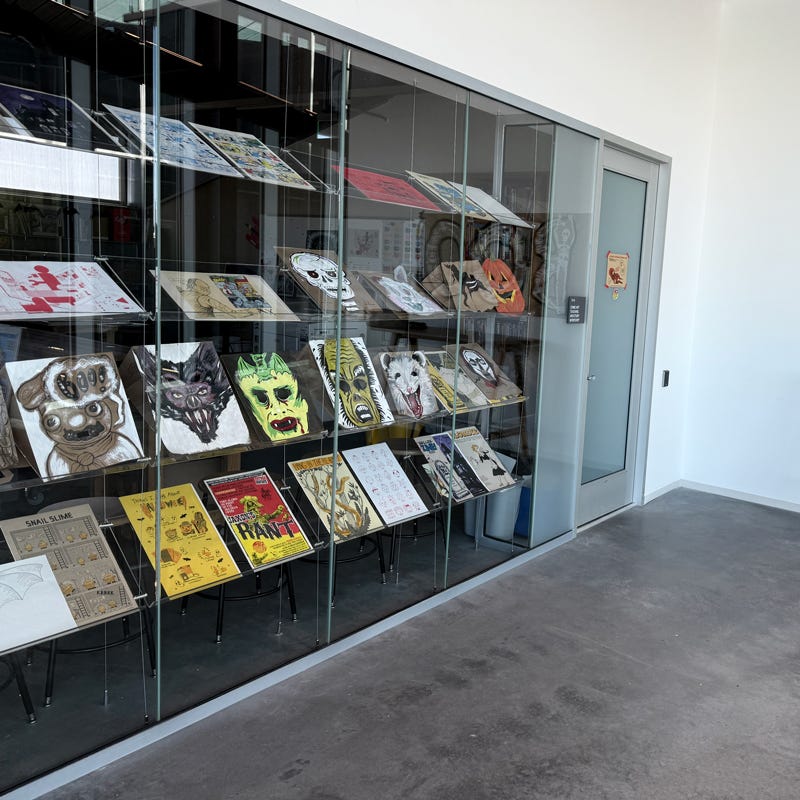 The suite of spaces includes the workshop which has a more expanded book production capacity, the center of which is our Risograph printer — in addition to a wall lined with books and flat files full of art, a clean drawing room with flat tables, and an overflow workspace that doubles as a lounge / reception area with a panoramic view of the Houston skyline — it’s the best view in the building. Around the corner is a twenty-seat computer lab with a laser printer and a scanner. If you’re at all familiar with our former facilities, this all feels like science fiction. Downstairs, we have a small annex space for letterpress in our new print shop. It honestly feels like I woke up and a lot has happened while I was sleeping.